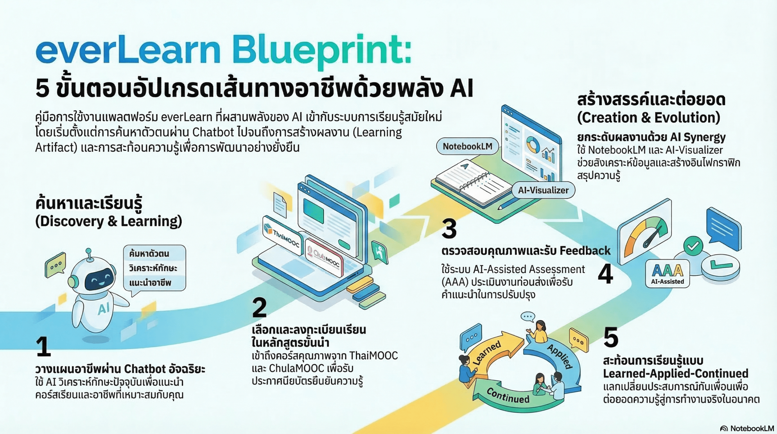 everLearn ไม่ได้เป็นเพียงแค่ระบบจัดการการเรียนการสอน แต่เป็นระบบนิเวศการเรียนรู้ที่ครบวงจร ที่ช่วยให้ผู้เรียนสามารถเชื่อมโยงความรู้จากหลักสูตรต่าง ๆ เข้าด้วยกัน พร้อมรับคำแนะนำจาก AI Chatbot อัจฉริยะ และเข้าถึงชุมชนผู้เรียนที่ช่วยเสริมแรงบันดาลใจในการเติบโตทางวิชาชีพอย่างต่อเนื่อง