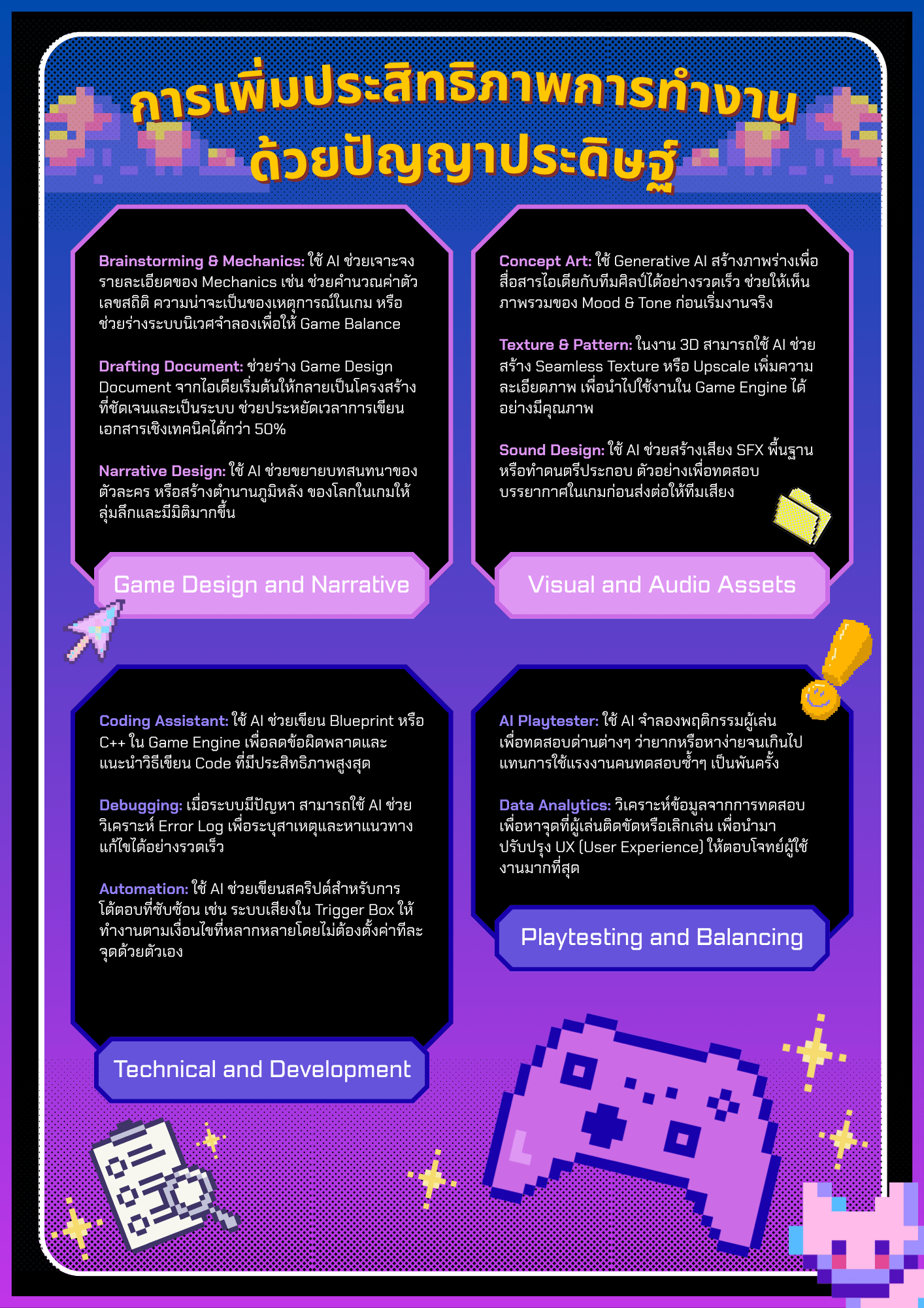 ได้เรียนรุ้เกี่ยวการใช้Aiให้เกิดประโยชน์ที่สุด ในด้านผู้ช่วยคิดและในด้านผู้ช่วยทำ ซึ่งสามารถนำไปประยุกต์ใช้ในอาชีพอนาคตได้ เช่น การหาข้อมูลประวัติศาสตร์ที่น่าสนใจแล้วนำมาประกอบในการทำเกม
